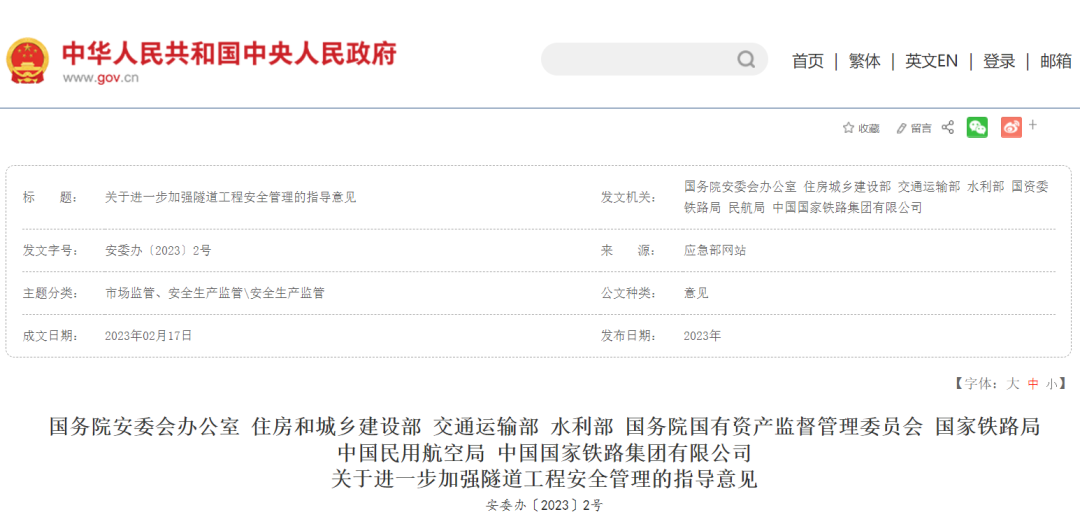 2023年2月,國務(wù)院安委會辦公室、住房和城鄉(xiāng)建設(shè)部、交通運(yùn)輸部等8部門印發(fā)《關(guān)于進(jìn)一步加強(qiáng)隧道工程安全管理的指導(dǎo)意見》,指出隧道施工建設(shè)需加大機(jī)械化、信息化及先進(jìn)技術(shù)推廣應(yīng)用,從而提升工程重大風(fēng)險(xiǎn)防范化解能力。