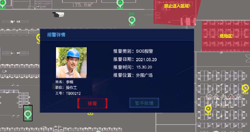 工人配備UWB標(biāo)簽,在發(fā)生安全事故(在發(fā)生坍塌、墜落、物體打擊、觸電等)、突發(fā)疾病、發(fā)現(xiàn)設(shè)備故障等緊急情況,在人員有意識的條件下,按下報(bào)警按鈕,可一鍵發(fā)出SOS呼救報(bào)警。遇險(xiǎn)人員的精確位置信息實(shí)時(shí)傳輸至告警平臺,平臺在第一時(shí)間告知值班人員處理,最大限度地爭取救援時(shí)間,將損失降至最低。