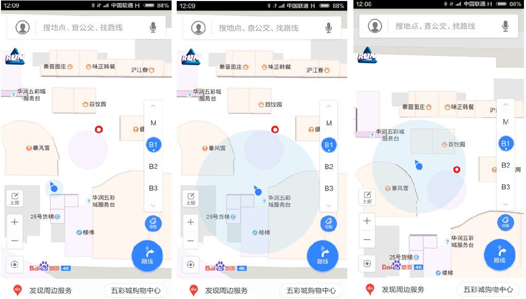 然而,后來一切進展的并不順利。到現在2016年下半年已經有幾年時間過去了,室內定位應用似乎并沒有走進大家的生活。手機地圖APP在大型購物中心里還是不好用,人們在停車場依然要費勁才能找到自己的車。近日,筆者在北京IT公司聚集地附近的清河華潤五彩城購物中心實地測試室內定位的效果。用Android手機打開百度地圖APP進行室內定位測試,下圖是筆者在同一點(紅圈)進行三次定位得到的結果(藍圈范圍),可以看到定位結果很不穩定,甚至時常會把我定位到購物中心的外面。換成高德地圖(被阿里收購)、騰訊地圖,換成其它購物中心,效果都類似。用IOS手機則定位效果更差(原因后文會講)。定位不穩定、結果不可信,造成室內定位應用不能進入大眾生活,相關生態也無法建立。筆者覺得這里恰好隱藏著很大的機會。