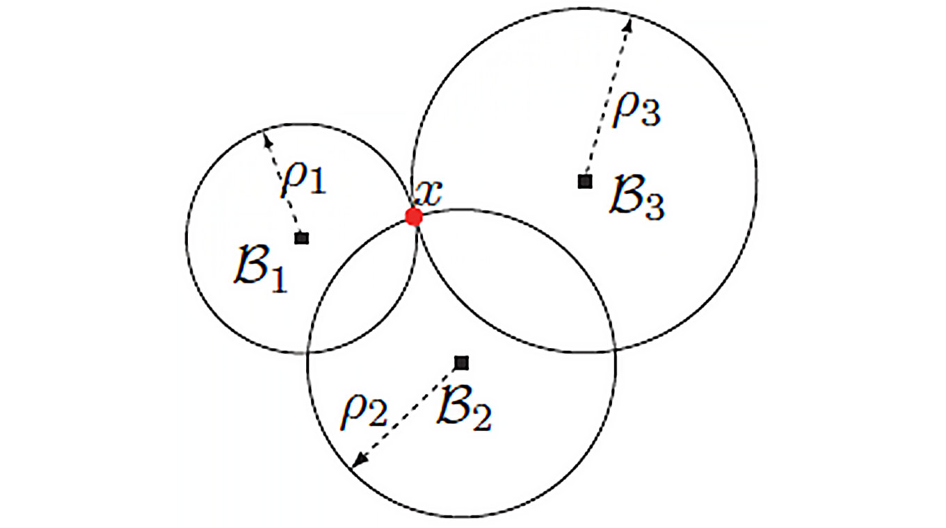 已知待定位終端(如手機)分別到n個已知位置的基站(如固定在室內屋角)距離,那么分別以每個基站為圓心,以終端到該基站距離為半徑,可畫出n個圓,這n個圓的交點位置就是手機的位置。n為3可以定出終端在二維平面上的位置;n為4可定出基站在三維空間的位置。這就是三邊定位的基本原理,如下圖所示。