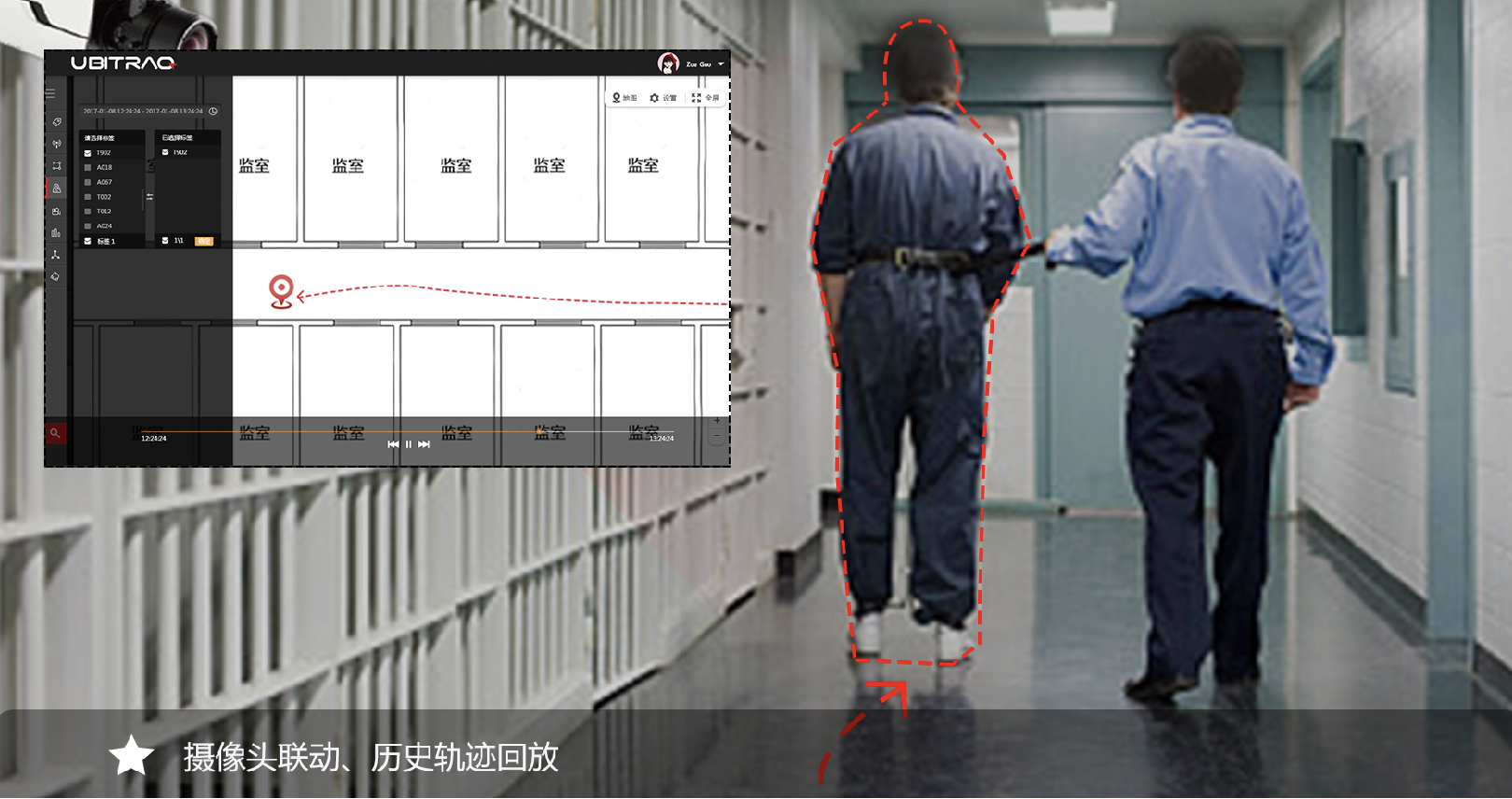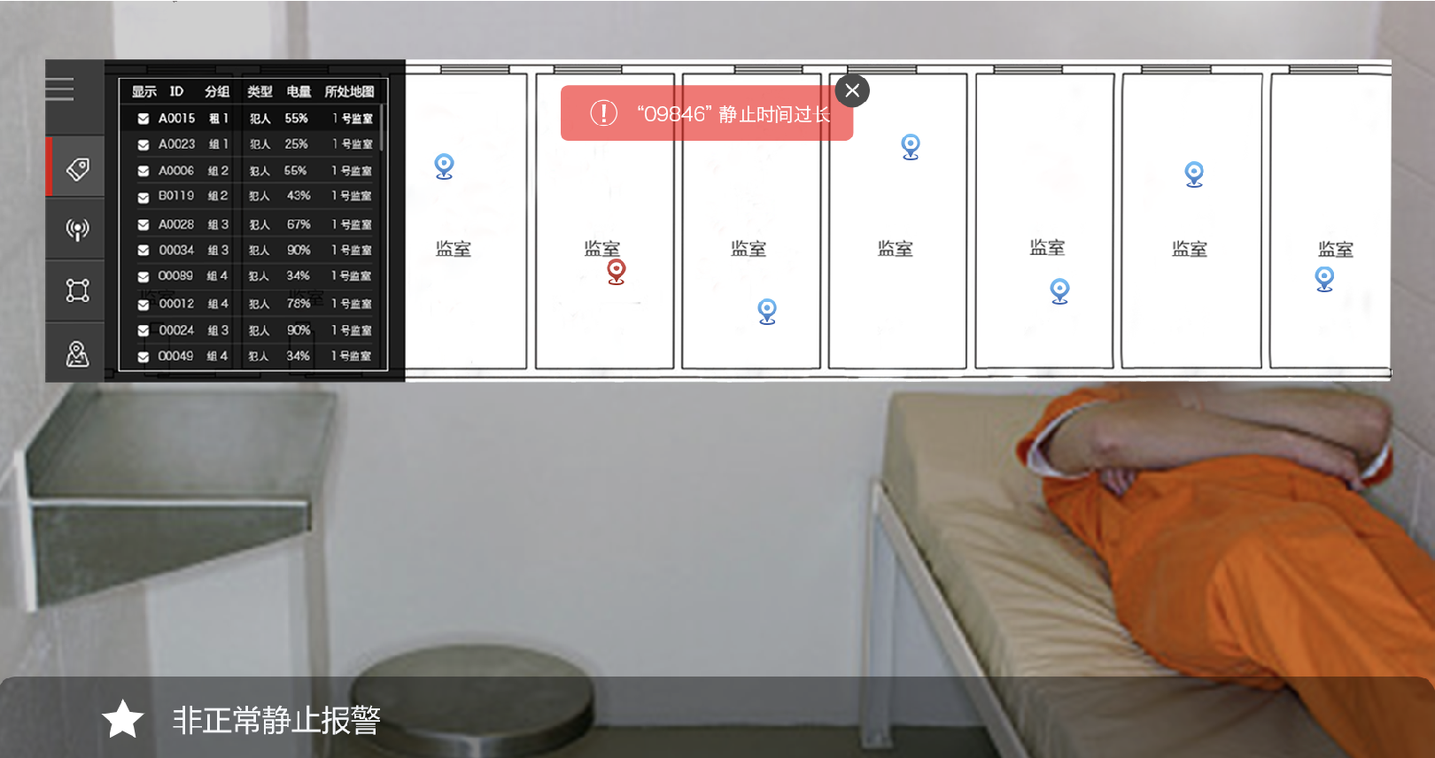 全跡科技監(jiān)獄高精度定位管理系統(tǒng)使用UWB室內(nèi)定位技術(shù),通過在監(jiān)所區(qū)域安裝定位基站,為犯人和獄警佩戴定位標(biāo)簽的形式,實(shí)現(xiàn)人員精準(zhǔn)實(shí)時(shí)定位。能夠隨時(shí)掌握人員在監(jiān)所中的位置、活動(dòng)軌跡以及監(jiān)所各區(qū)域人員分布情況等,系統(tǒng)后臺可以設(shè)置禁區(qū)入侵、脫離監(jiān)管報(bào)警等并有視頻聯(lián)動(dòng)功能,便被動(dòng)監(jiān)管為主動(dòng)監(jiān)管。系統(tǒng)支持全天候動(dòng)態(tài)點(diǎn)名,對犯人進(jìn)行24小時(shí)位置監(jiān)控和軌跡跟蹤,使監(jiān)獄管理工作更加智能化。