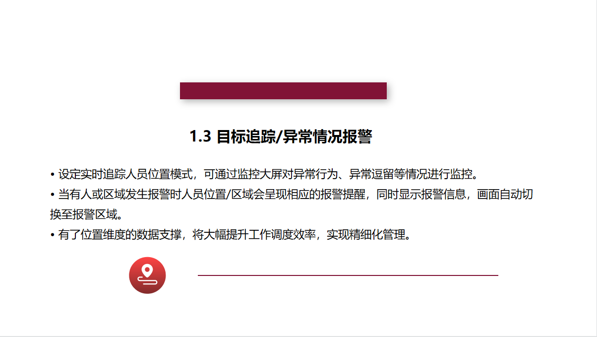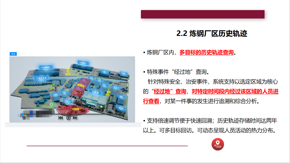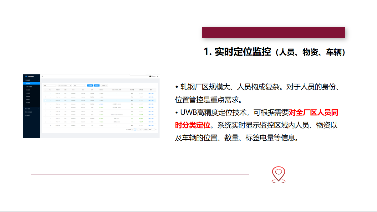 全跡科技UbiTraq冶金鋼鐵高精度定位系統(tǒng),通過(guò)在廠區(qū)內(nèi)布設(shè)規(guī)定數(shù)量的UWB定位基站,實(shí)時(shí)精確地對(duì)人員、車輛、資產(chǎn)上的標(biāo)簽進(jìn)行定位,并將位置信息顯示在廠區(qū)的控制中心,進(jìn)行安全區(qū)域管控、人員在崗監(jiān)控等,最大限度地避免事故的發(fā)生,助力冶金鋼鐵企業(yè)實(shí)現(xiàn)智慧化的安全運(yùn)營(yíng)管理。