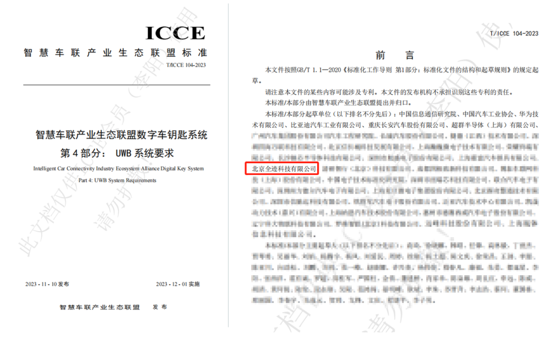 二、全跡科技參編制定國(guó)內(nèi)首個(gè)系統(tǒng)級(jí)UWB數(shù)字車鑰匙標(biāo)準(zhǔn),即智慧車聯(lián)產(chǎn)業(yè)生態(tài)聯(lián)盟(ICCE)標(biāo)準(zhǔn):《數(shù)字車鑰匙系統(tǒng) 第4部分:UWB系統(tǒng)要求》。該標(biāo)準(zhǔn)由中國(guó)信息通信研究院、中國(guó)汽車工業(yè)協(xié)會(huì)牽頭起草,2023年11月10日發(fā)布,2023年12月1日實(shí)施。