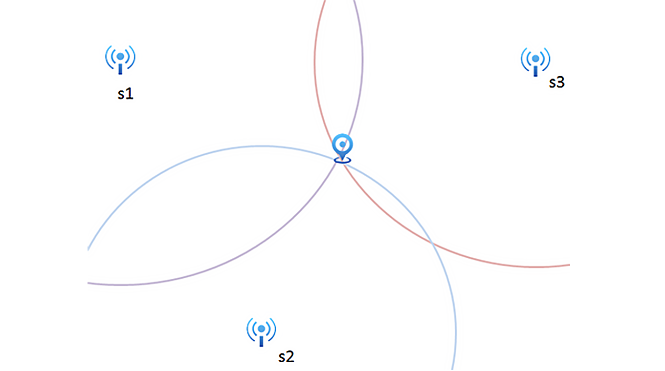 圖1-3是根據(jù)到各個基站的測距信息,以基站為中心畫圓,就可以得到一個交點,交點就是標簽的位置。