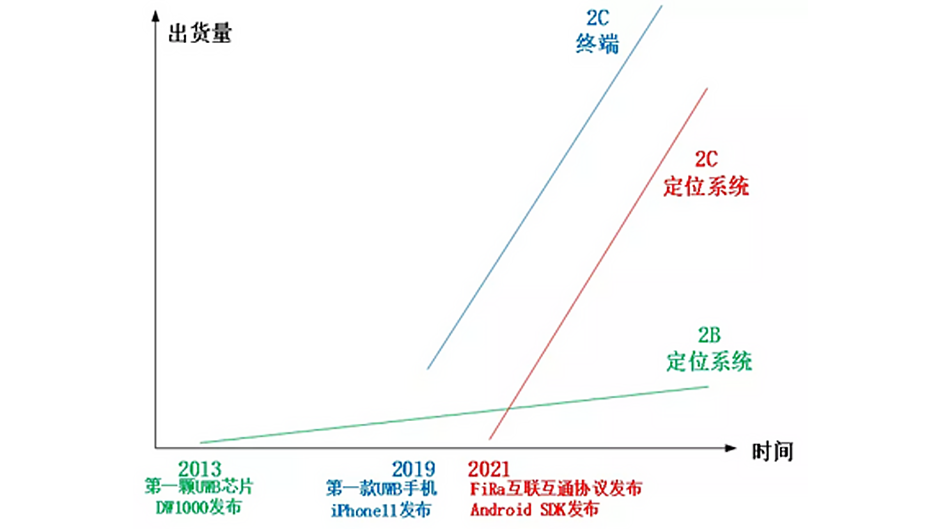 很多人說(shuō):新機(jī)會(huì)產(chǎn)生在行業(yè)變革期,UWB行業(yè)此刻就在發(fā)生大變革。從13年愛爾蘭Decawave(20年初被Qorvo收購(gòu))發(fā)布第一顆UWB芯片DW1000開始,很多公司基于該芯片做自己的UWB定位系統(tǒng);與大多數(shù)B端行業(yè)類似,UWB行業(yè)整體是平緩上升的曲線(圖中綠色線),是做項(xiàng)目的模式,不被大多數(shù)投資機(jī)構(gòu)看好。