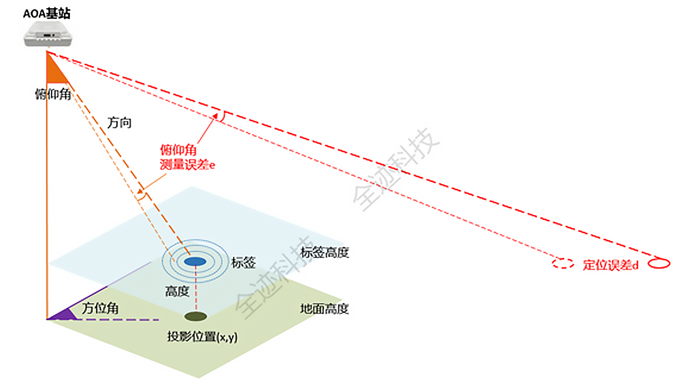 而UWB-AOA可以通過TOF精確測距。定位原理是先測方向,再沿著該方向測量標簽距離,單臺基站可以直接輸出標簽的3D坐標,該坐標的投影是2D坐標。誤差變得非常小,而且不隨俯仰角范圍有明顯變化。在實際設計中,全跡的UWB-AOA基站配合良好的天線設計可以覆蓋近乎0~90°俯仰角的完整半球。