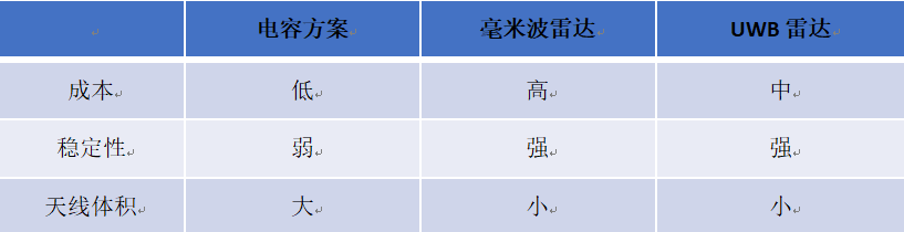毫米波雷達(dá)是一種備選替代方案,通過(guò)對(duì)毫米波雷達(dá)回波的分析,可以有效檢測(cè)踢腿的動(dòng)作。并且毫米波不受周邊電磁環(huán)境的干擾,雨水的影響也不大。目前車(chē)載毫米波腳踢尾箱雷達(dá)最大的問(wèn)題是價(jià)格較昂貴(相比電容方案和UWB雷達(dá)方案)。UWB雷達(dá)提供了另一種選項(xiàng)。穩(wěn)定性足夠高(相比電容方案),成本適中(比電容方案貴,比毫米波方案便宜),低功耗(低于毫米波雷達(dá))。